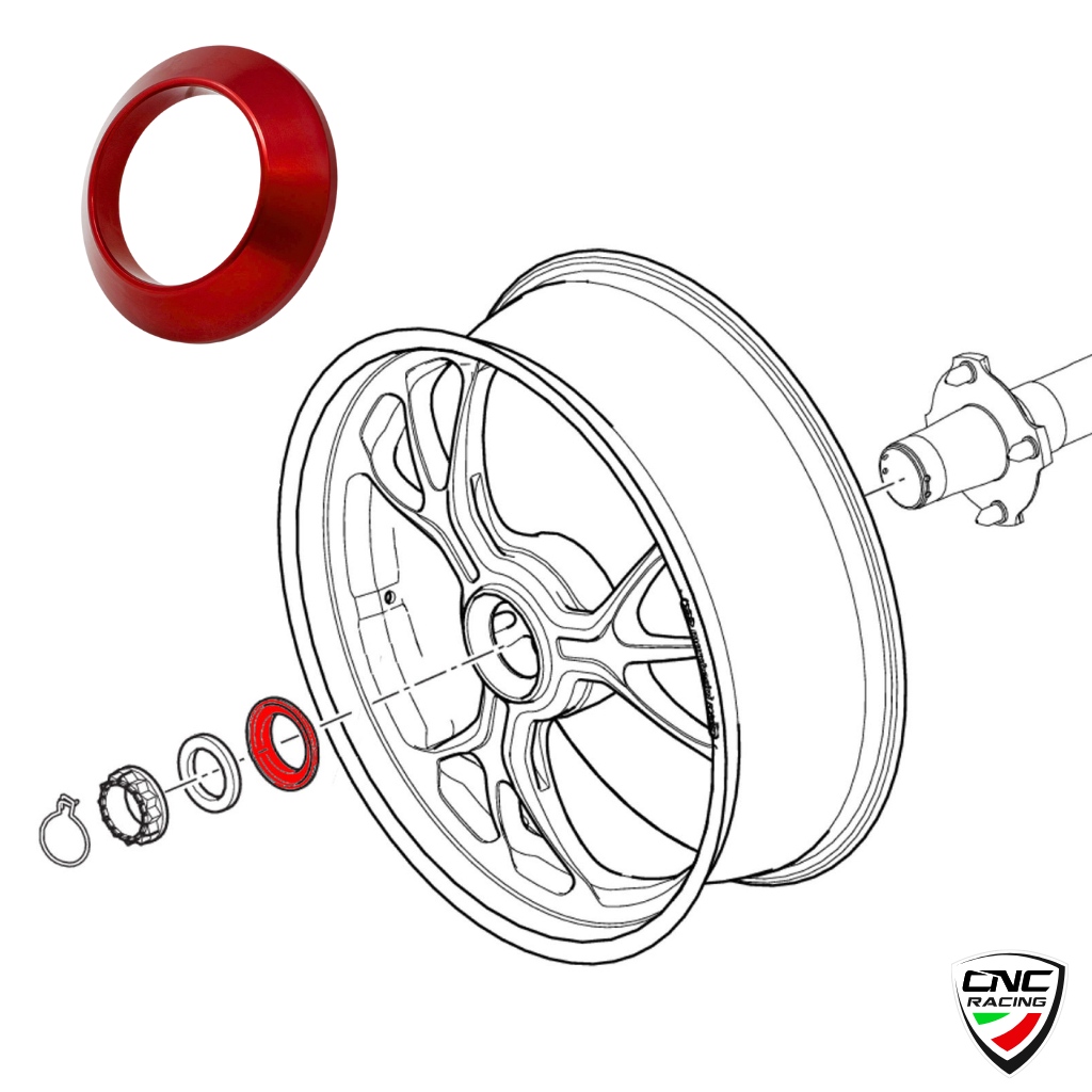 Conical spacer for Ducati rear wheel nut made in light alloy, machined from solid and then anodized for a high quality finish.