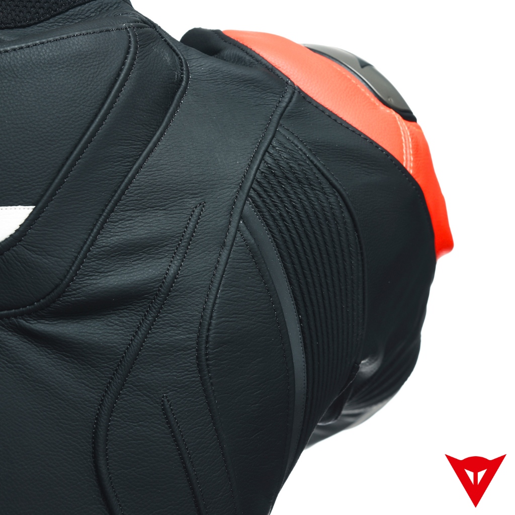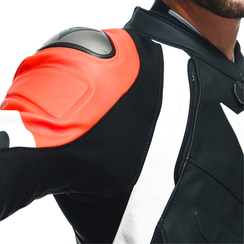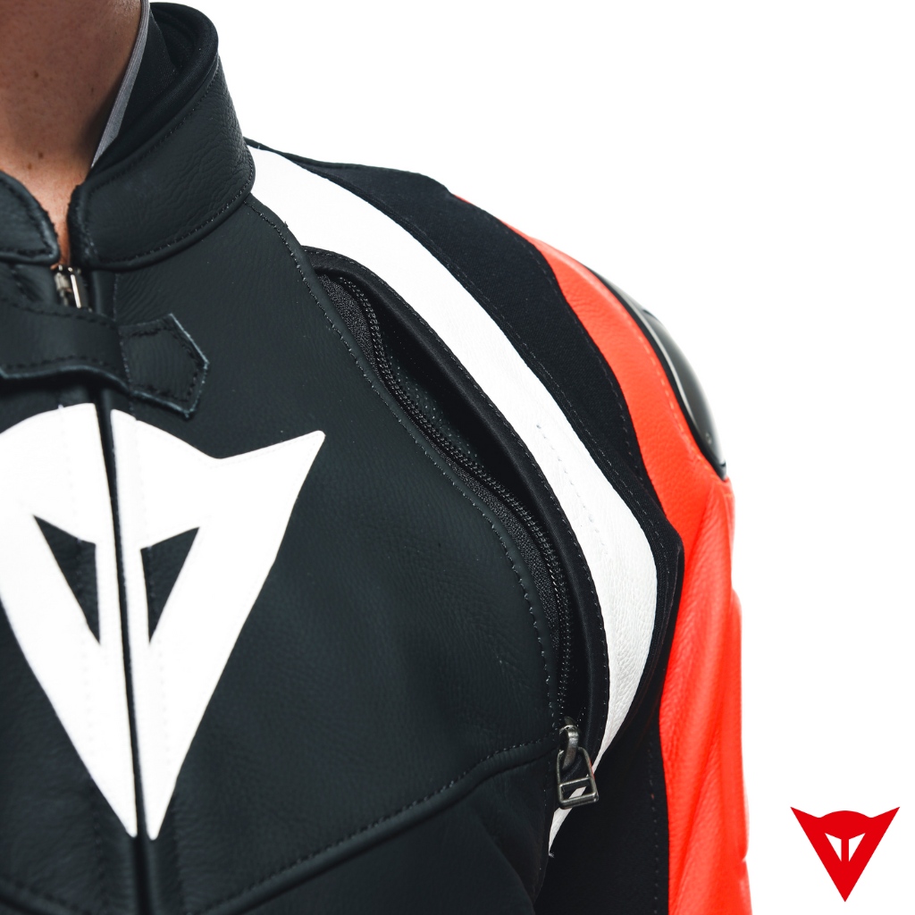 Microelastic 2.0 leather inserts on the back and arms that increase freedom of movement while maintaining skin protection, and air vents on the chest that can be opened and adjusted using the zippers.