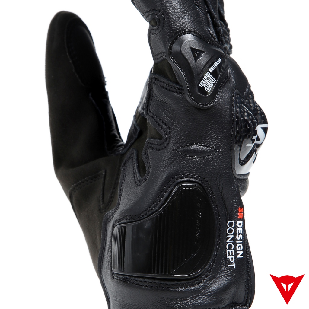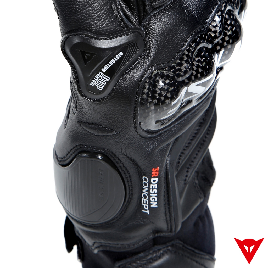 The Dainese Carbon 4 short motorcycle gloves are a sport model that combines comfort, coolness and ventilation deriving from the mesh inserts on the back, top safety standards guaranteed by the DCP protection system on the little finger, the strength of the leather and the protection provided by carbon knuckles, designed for optimal ergonomic performance and comfort of fit.