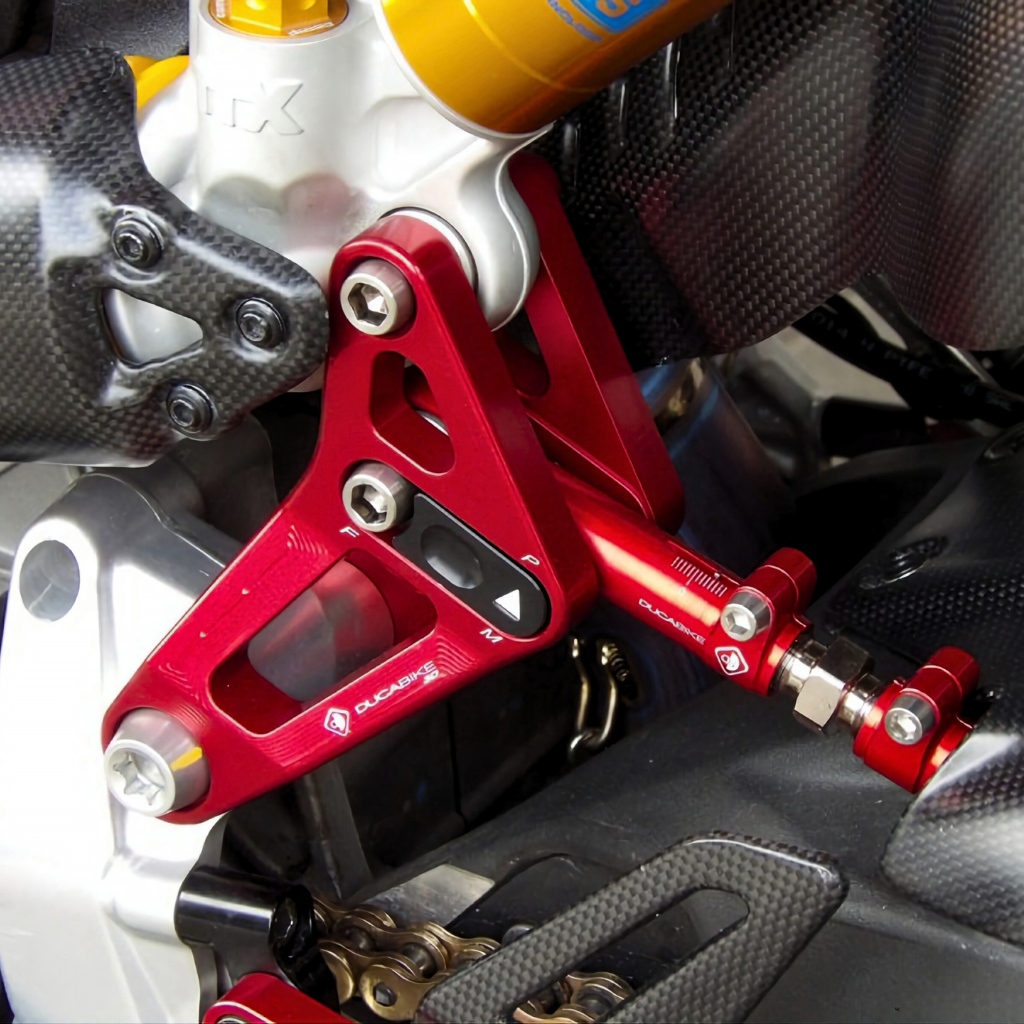The DucaBike linkage ADR04 OR ADR05 (available separately) provides a third interim adjustment for precise set-ups & geometry configurations, and for aesthetic modification purposes.